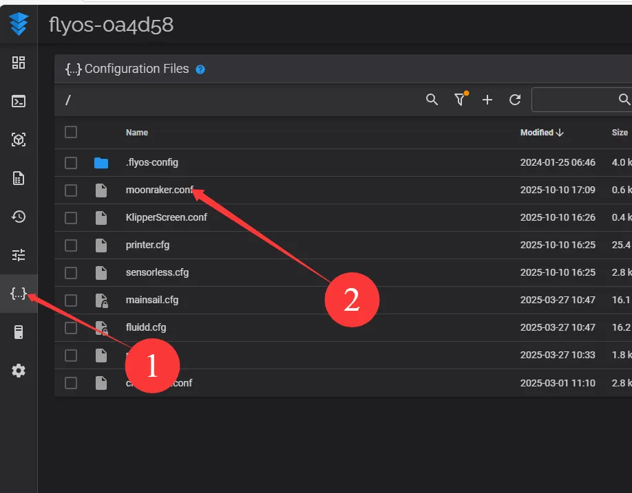 • 进入打印机配置界面,找到 moonraker.conf 文件