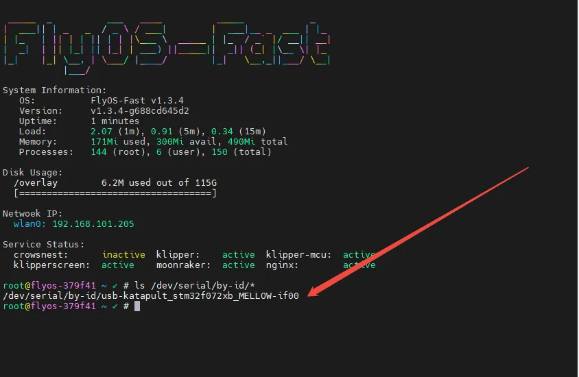 下图中的 /dev/serial/by-id/usb-katapult_rp2040_E662549553642032-if00 即为主板ID