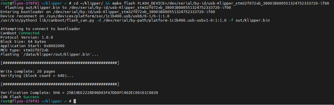 cd ~/klipper/ && make flash FLASH_DEVICE=<你的主板ID>