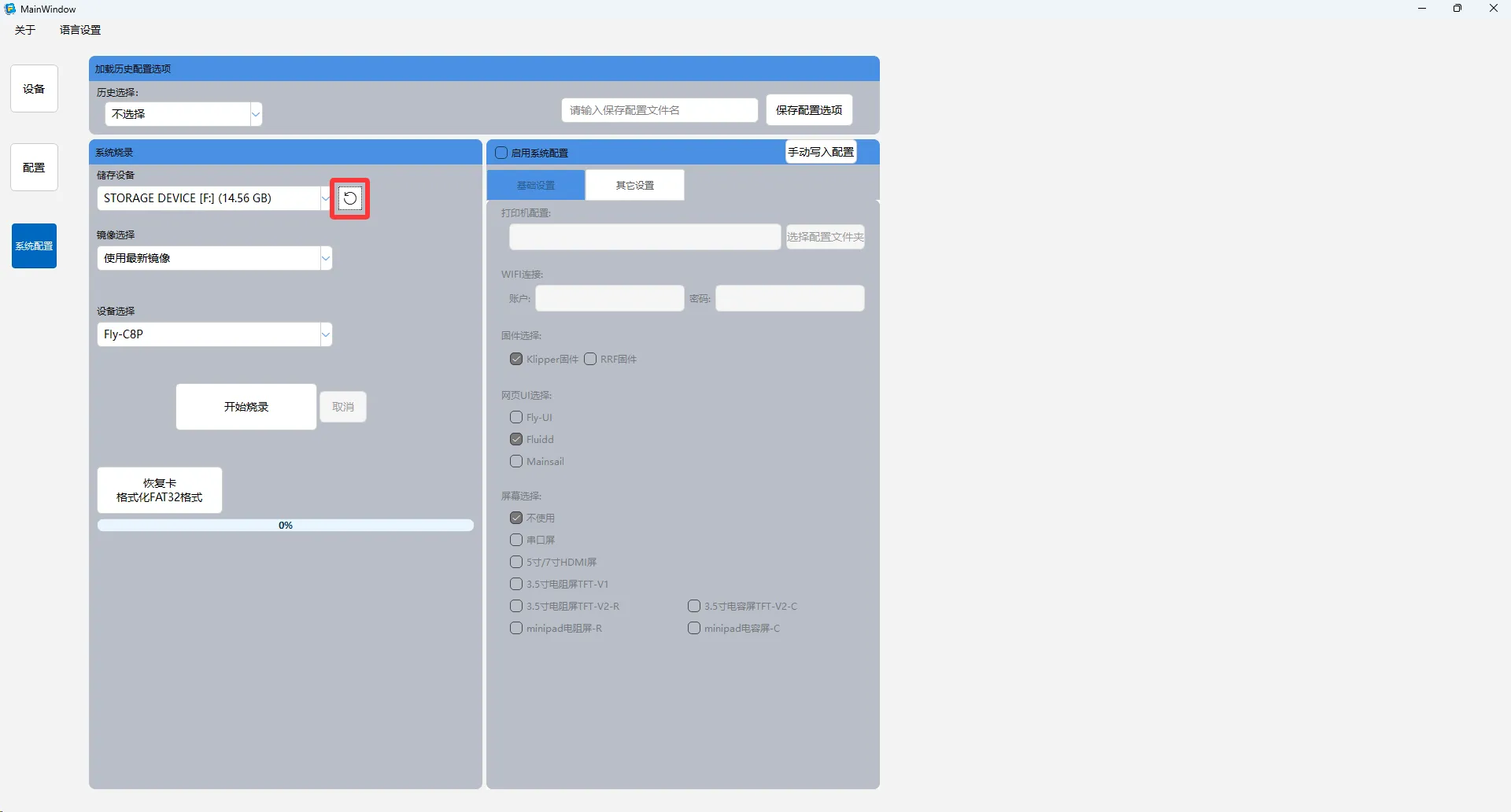点击 存储设备 旁的 刷新 按钮,确保系统正确识别到已连接的存储卡。