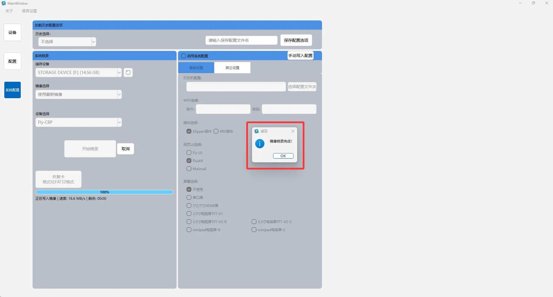 等待烧录进度完成,当界面显示"完成"提示时,表示系统镜像已成功写入。