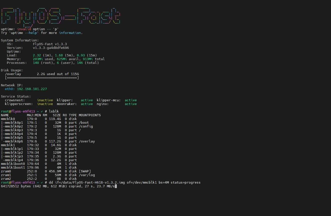 dd if=/data/your_system_image_filename.img of=/dev/your_tf_card_device_name bs=4M status=progressdd if=/data/FlyOS-Fast-H618-v1.3.2.img of=/dev/mmcblk1 bs=4M status=progress