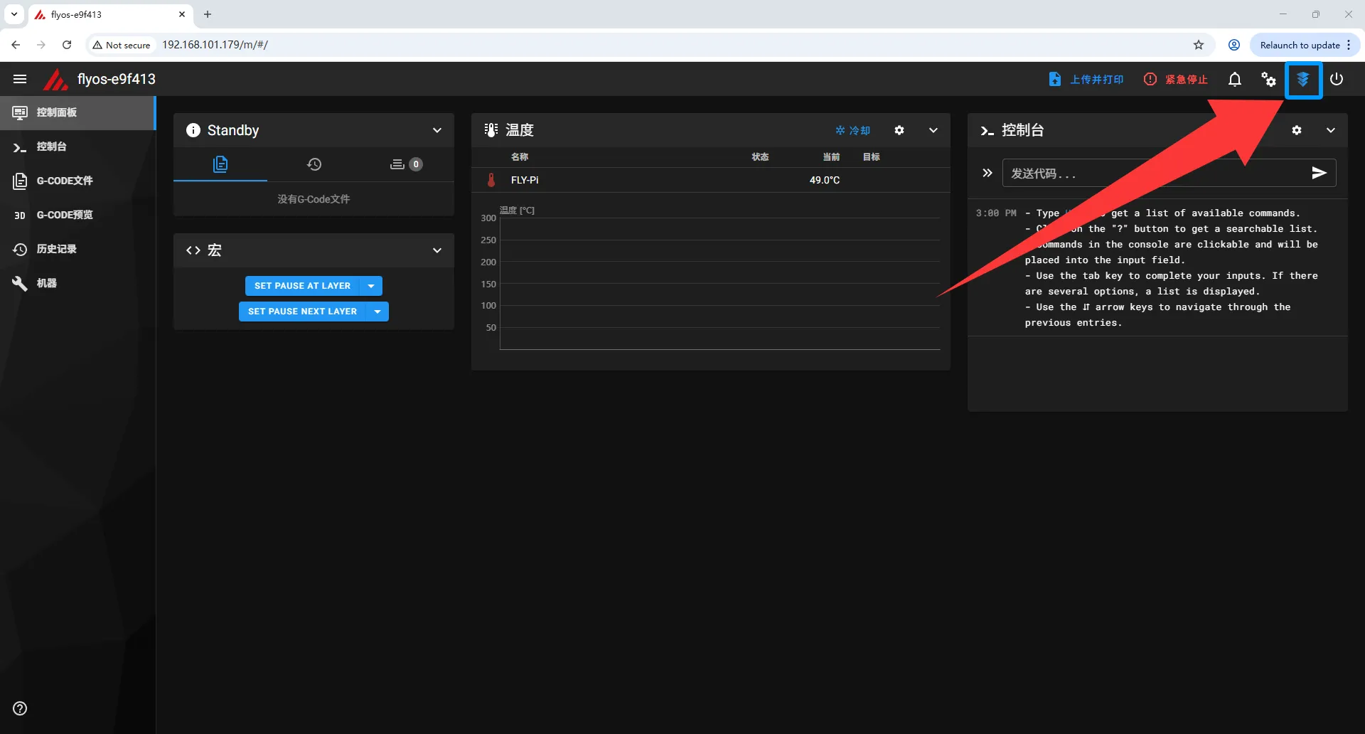 FLYOS-FAST系统中,可通过点击右上角的mainsail/fluidd图标来实时切换fluidd/mainsail WEB控制台!