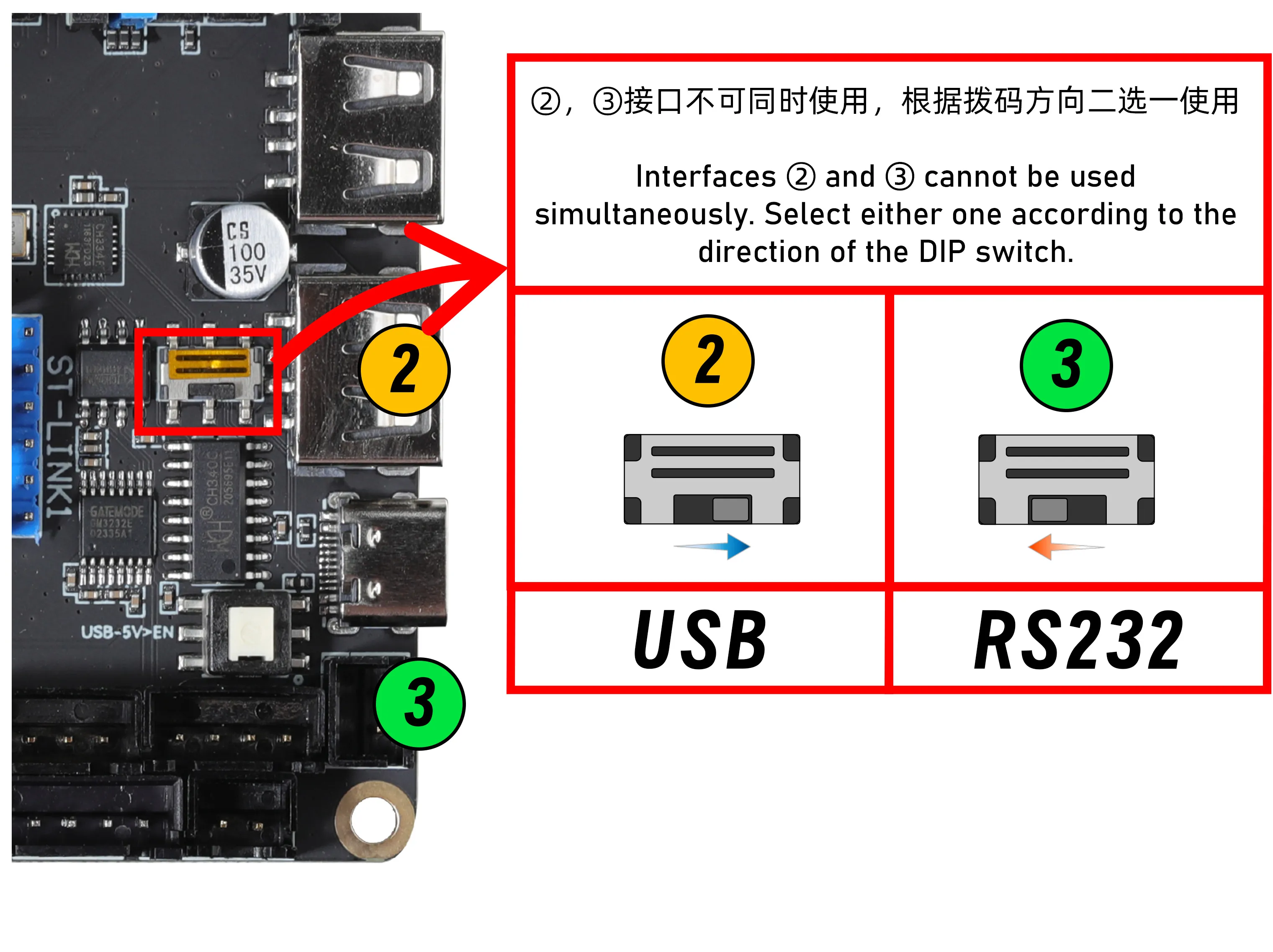| 左側にスライド | RS232シリアルポートモード | RS232インターフェース❸ | RS232対応ツールボード接続 |