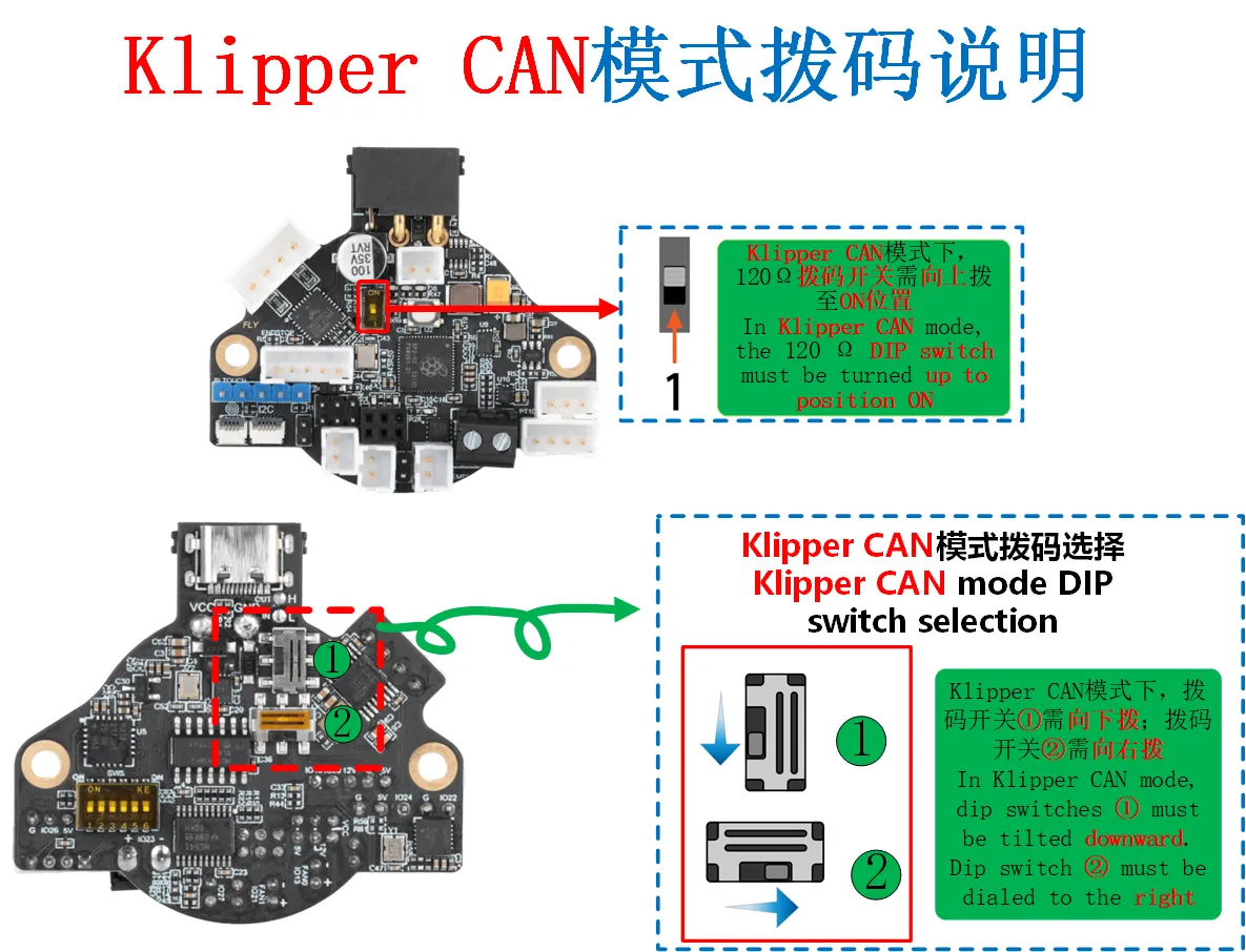 3. 正しい位置に設定: CANモードを使用するには、すべてのスイッチを下記の例の位置に設定する必要があります。